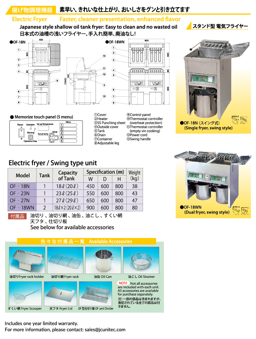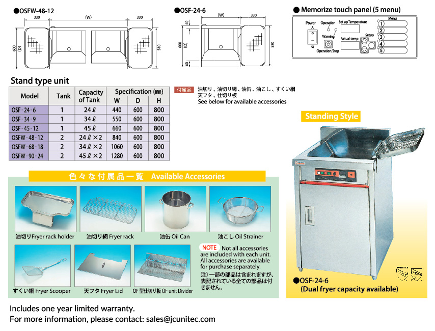 Accessories | Fryer rack holder, Fryer rack, Oil can, Oil strainer, Fryer scooper, Fryer lid, OF unit divider | |||||